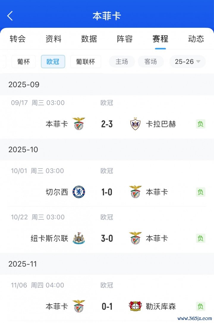 本菲卡四连败:2-3卡拉巴赫、0-1切尔西、0-3纽卡、0-1勒沃库森