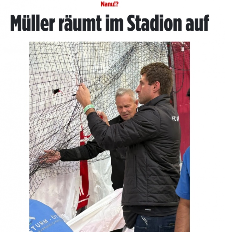 在拜仁5-0大胜汉堡的赛事 开赛前,安联运动活动 场 内突然出现一位与穆勒极为相似的男子。他身穿俱乐部夹克,正在协助清理南看台死忠球迷刚刚用于TIFO表演的红白塑料膜。