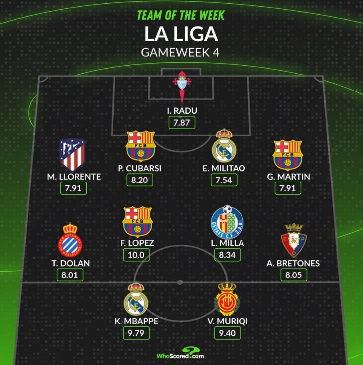 Whoscored评本轮西甲最佳阵:姆巴佩领衔,费尔明,米利唐在列