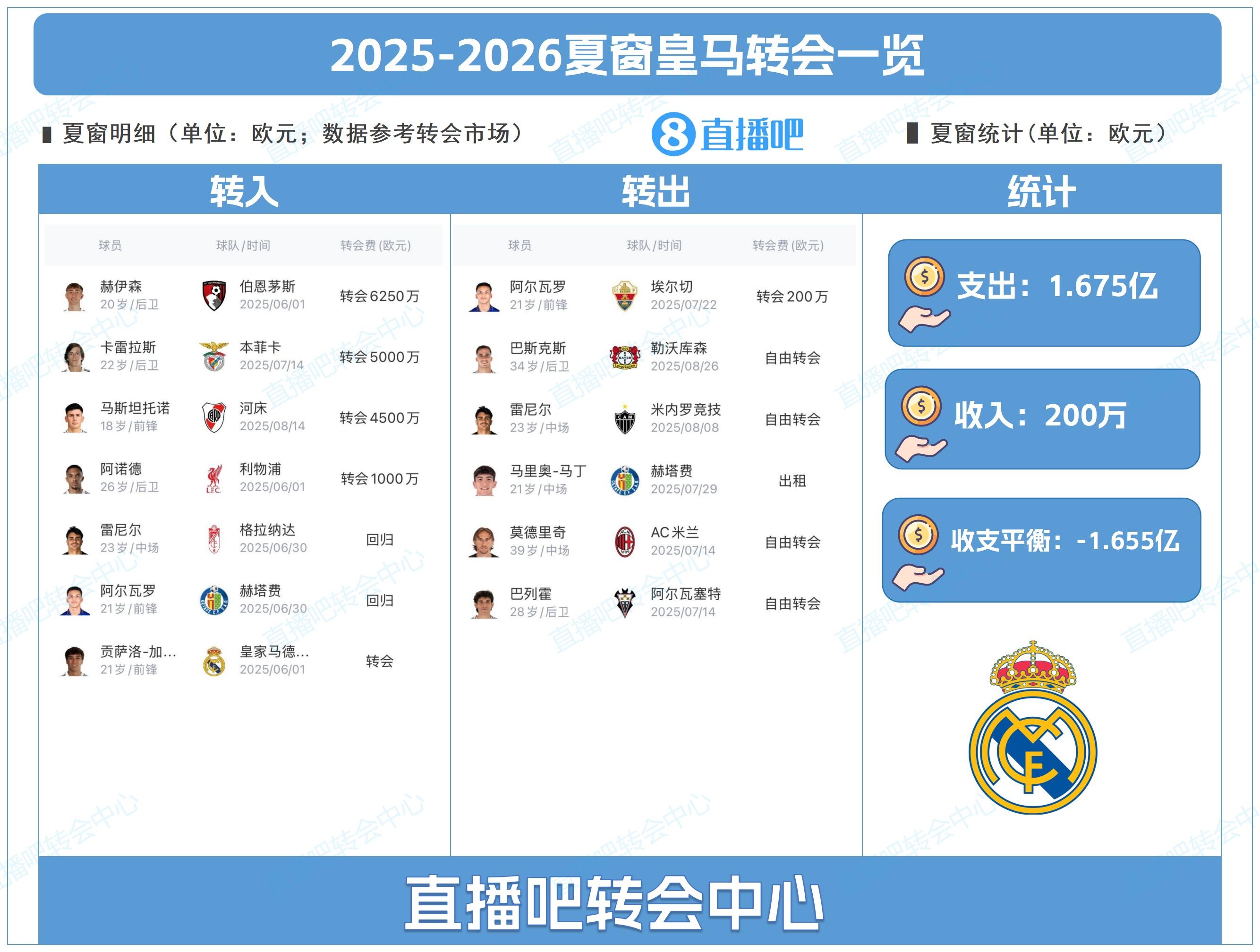 1:赫伊森 后场球员 6250万欧元 伯恩茅斯→皇马