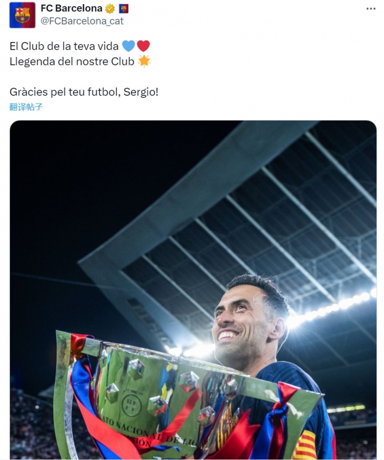 随后,巴萨官方发文:“你一生的俱乐部💙❤️我们俱乐部的传奇🌟感谢你的古代足球 ,布斯克茨!”