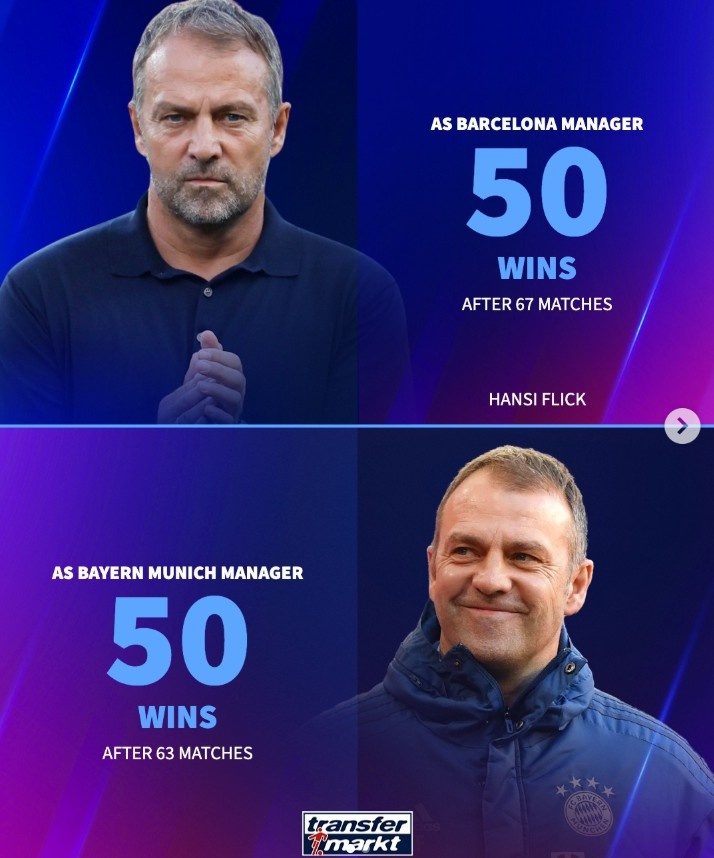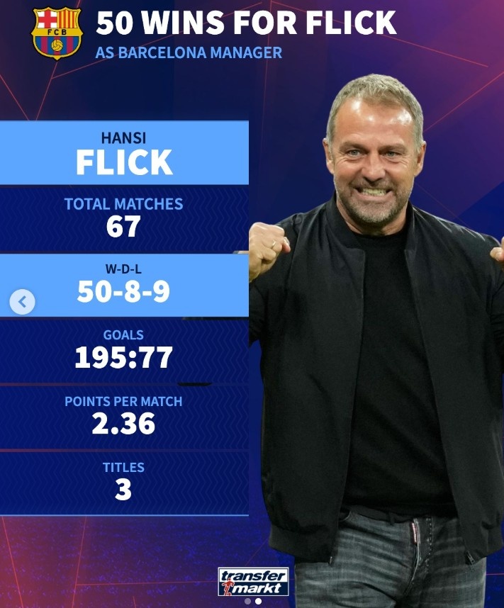 弗里克带巴萨67场实现50胜里程碑,场均拿2.36分、夺得3冠