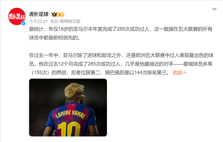 18岁统治五大职业联赛 ! 亚马尔一数据断档领跑 , 多库姆巴佩都被甩翻倍
