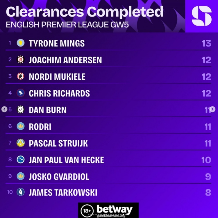 英超第5轮解围榜:明斯13次居首,约西姆-安德森等三人12次第二