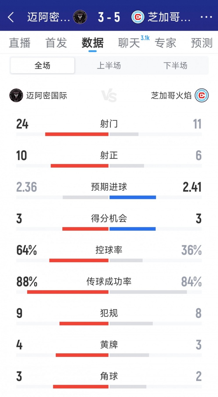得分 大战,迈阿密国际3-5芝加哥火焰数据:射球 24-11,射正10-6