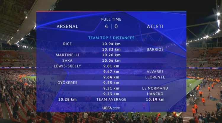 阿森纳VS马竞跑动数据:赖斯10.94KM全场最高,枪手3人超10KM