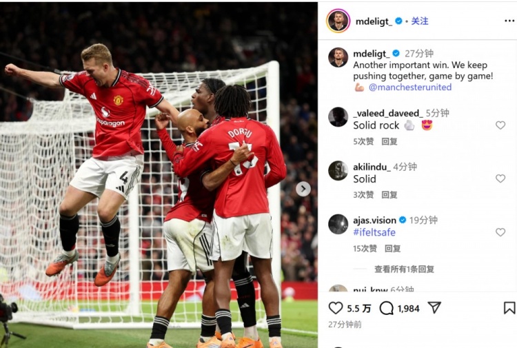 德里赫特社媒晒庆祝照:又一场重要获胜 !我们继续齐心协力!