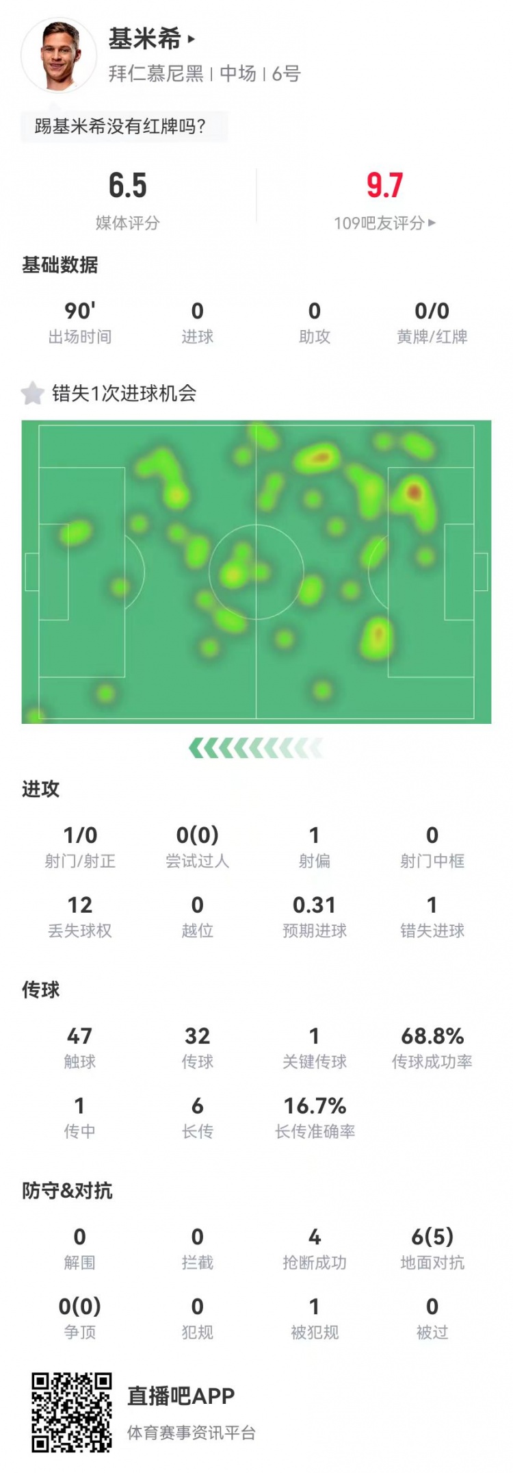 基米希本场1射1失良机+1关键传送球 4抄截 +6对峙 5成功 仅获6.5分