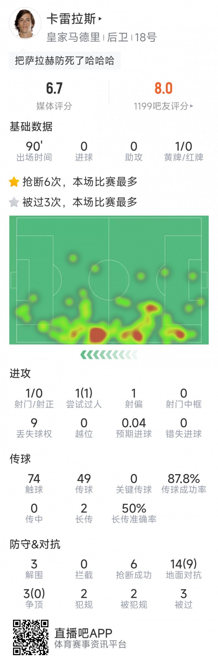 主防萨拉赫,卡雷拉斯本场数据:6次抄截 ,3次解围,9次成功对峙