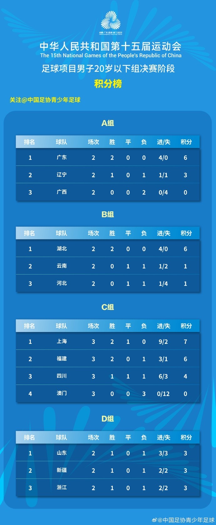 全运会男足U20组小组赛积分榜和第四、五、六赛事 日对阵