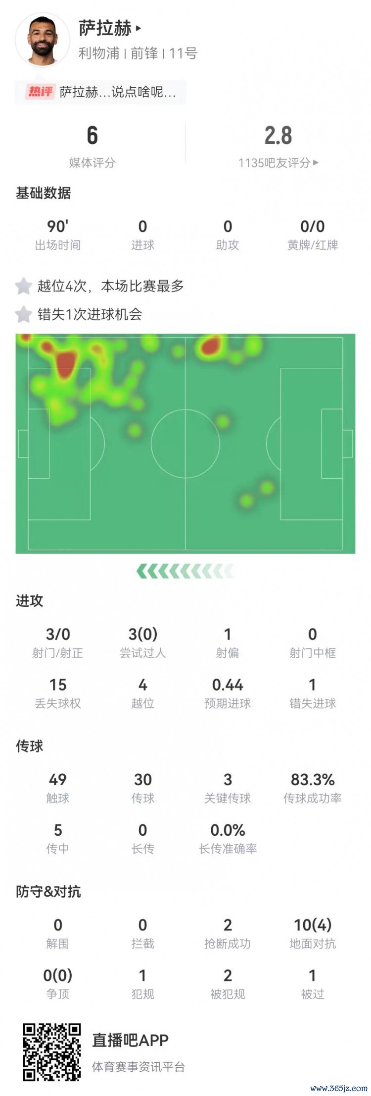 萨拉赫本场3射0正+1失良机 3过人0成功 3关键传送球 +4越位违例 获评6分
